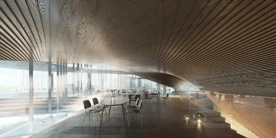 温室花园设计结合了旧钢铁车间的历史元素与现代设计理念。透明玻璃幕墙提供自然光,流线型结构使建筑轻盈如漂浮。钢铁与玻璃、直线与曲线的对比体现了“阴阳”思想,建筑顶部的绿色植被层有效隔热,减少能源消耗。